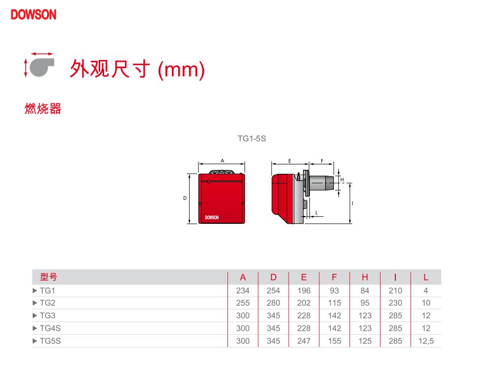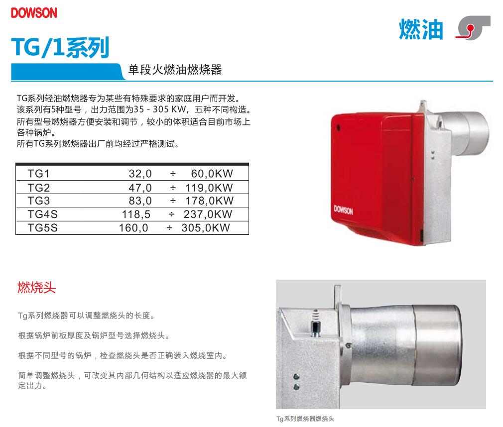 DOWSON 單段火燃(ran)油燃(ran)燒(shao)器TG/1系列(lie)專為某些有特(te)殊(shu)要求的家庭用戶而開發(fa)。該(gai)系列(lie)有5種(zhong)型號,出(chu)力范圍為35-305 KW,五種(zhong)不(bu)同構造。輕油燃(ran)燒(shao)器所有型號燃(ran)燒(shao)器方便安裝和調節,較小的體積(ji)適合目前市場上各種(zhong)鍋爐。所有TG系列(lie)燃(ran)燒(shao)器出(chu)廠前均經過嚴格測(ce)試。